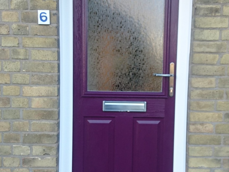 An Aubergine half glazed Composite Door, fitted in Cambridge by The Window Shop. White Fully Sculptured frame. Half glazed with obscure glass as requested by our Customer. Chrome Handle. Chrome Letterbox.